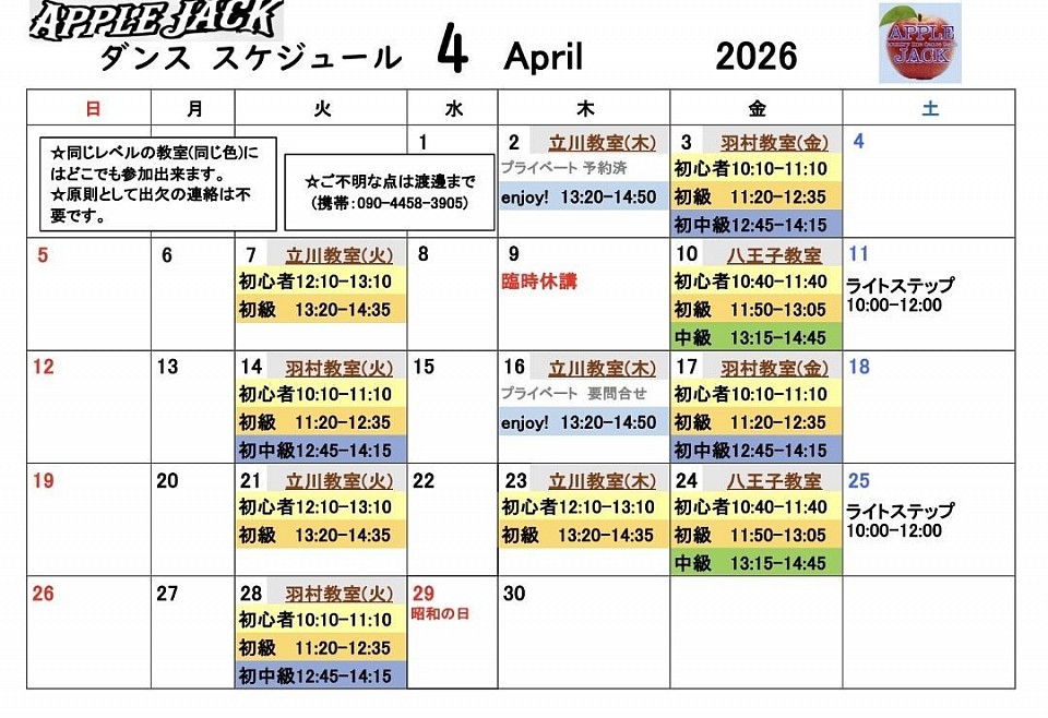 ② 3月より第1第3木曜の立川初心者クラスは第2第4木曜に移動になります。(立川enjoy!クラスはそのまま第1第3木曜に残ります)